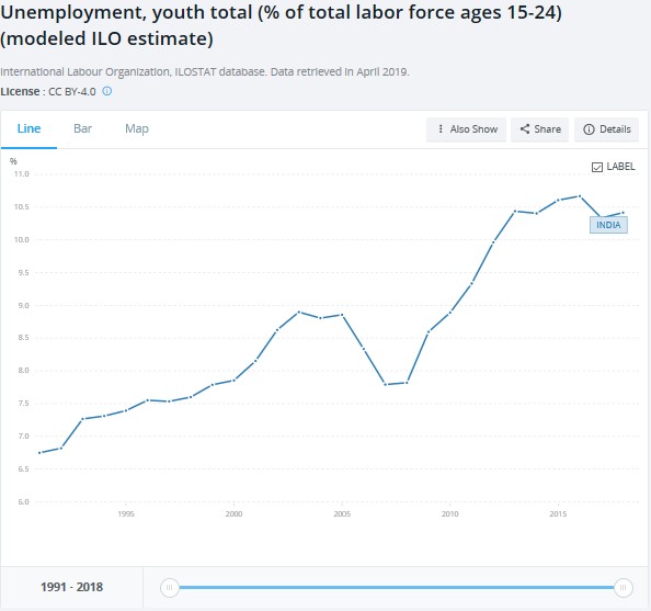 The study focuses on the disturbing patterns of the level of unemployment of youth in the country. It tries to identify the reasons which have led to the rise in the unemployment level of the youth in the country when the total unemployment level is falling. The indicators being used for the study are labour force participation rate, worker population ratio and literacy rate. The time period of the study is 1991-2018.