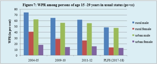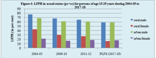 As can be very evidently seen from the table and the graph below, the labour force participation rate is falling from the time period 2011-12 to 2017-18. The reason behind this is more and more youth between the age group of 15-29 years now prefer pursuing higher studies.